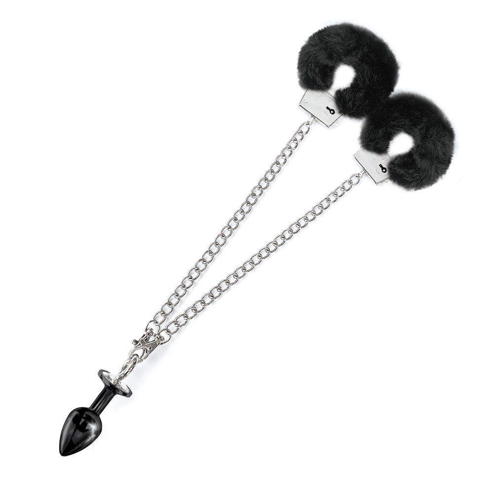 - Soft faux fur covered metal cuffs chained to a detachable black butt plug with a clear jewel.