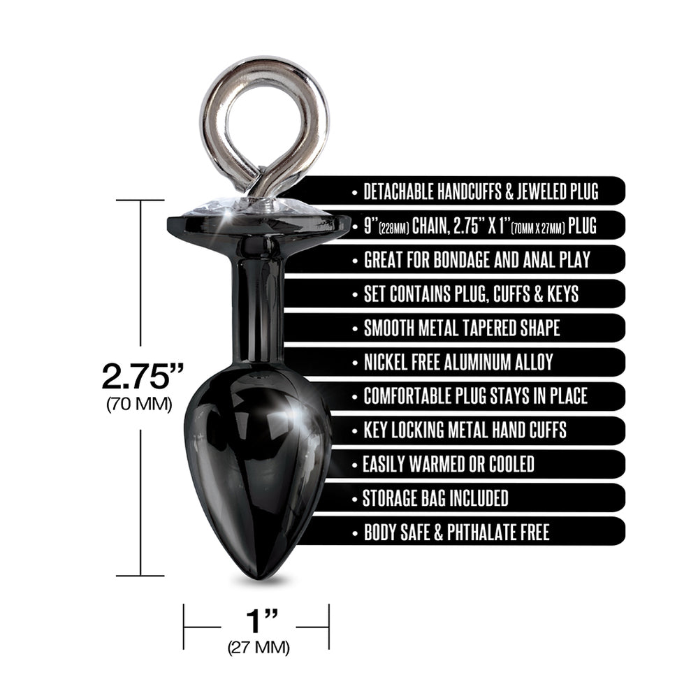 - Butt plug 2.75" x 1" and handcuffs are on a 9" detachable chain.