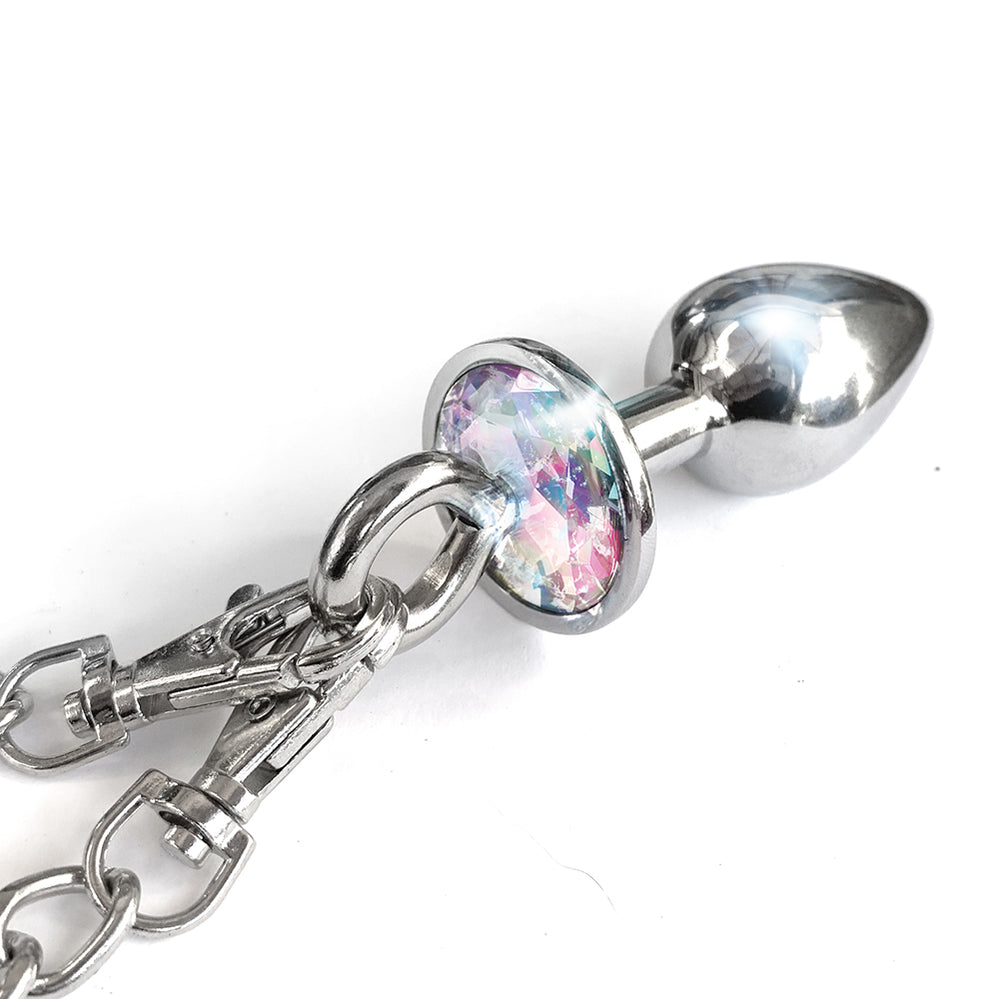 - Soft faux fur covered metal cuffs chained to a detachable silver butt plug with a magical rainbow jewel.