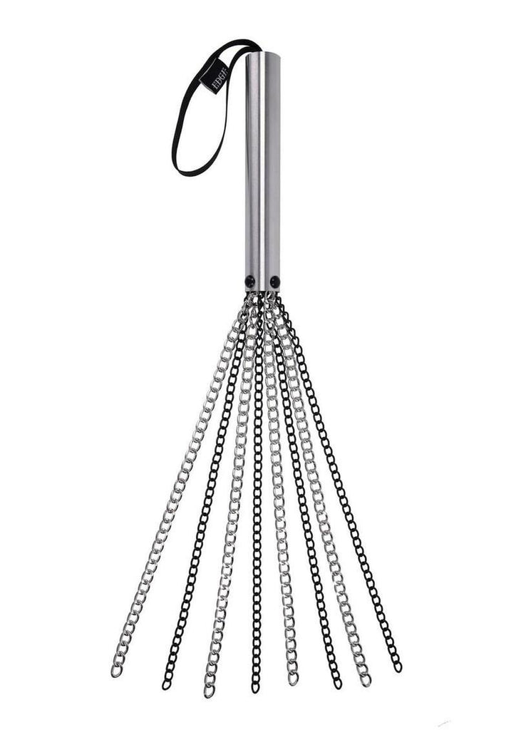 Weight, force, and absolute control. The Edge® Chain Flogger delivers impact with unmistakable authority, combining a solid silver-tone metal handle with eight black-and-silver chain falls engineered for deep, punishing strikes. Each swing lands with weighted force as the cascading metal links create a rhythmic, commanding thud that keeps the submissive in line. Chill the chains in the freezer before the scene for temperature play that blends shock, sting, and an icy bite. Durable black rivets secure every fall in place, while the black nylon wrist loop ensures steady handling through repeated, heavy use. Built for dominance, endurance, and elevated edge play, this flogger is crafted to make every strike count.
