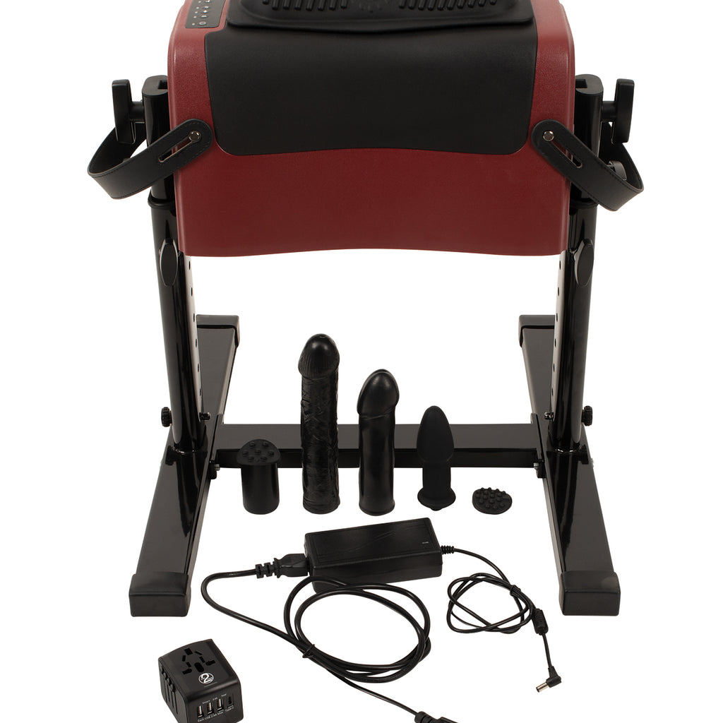 - The mains-powered fucking machine features a dotted vibro-pad seat and 3 attachments (2 vibrators, 1 butt plug) that can be combined in various ways for vibrating and penetrative fun.